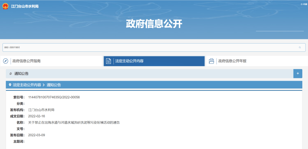 關于禁止在出海水道與河道水域洗砂洗泥等污染環境活動的通告